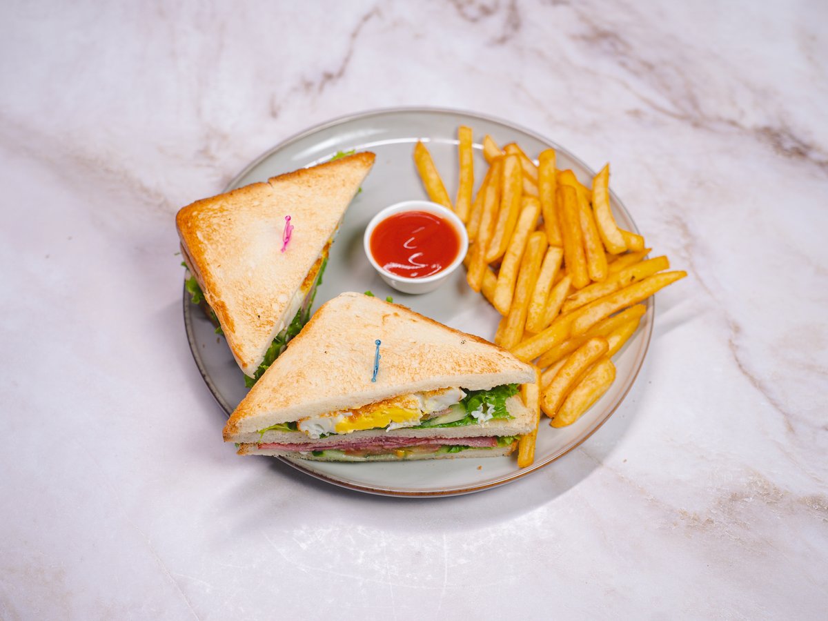 глазунья, тост “клаб” с говядиной и овощами