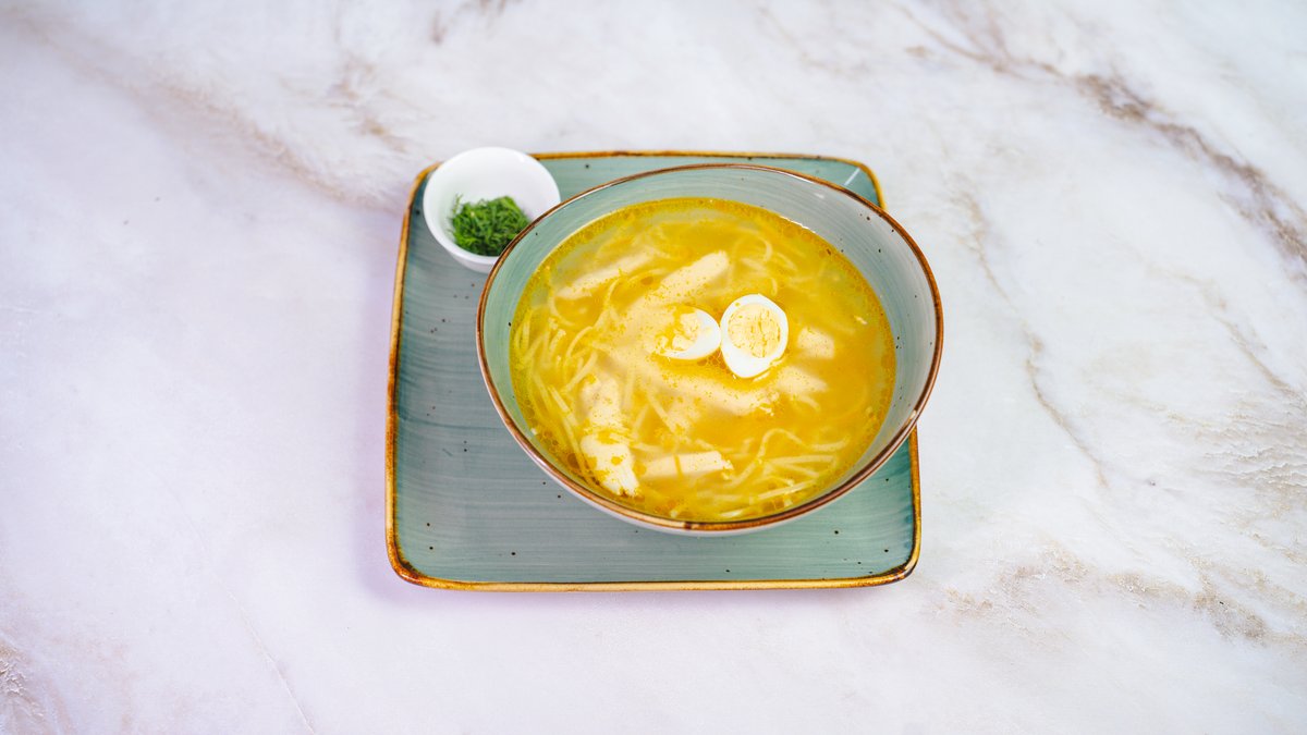 куриный бульон,лапша, зелень, перепелиное яйцо