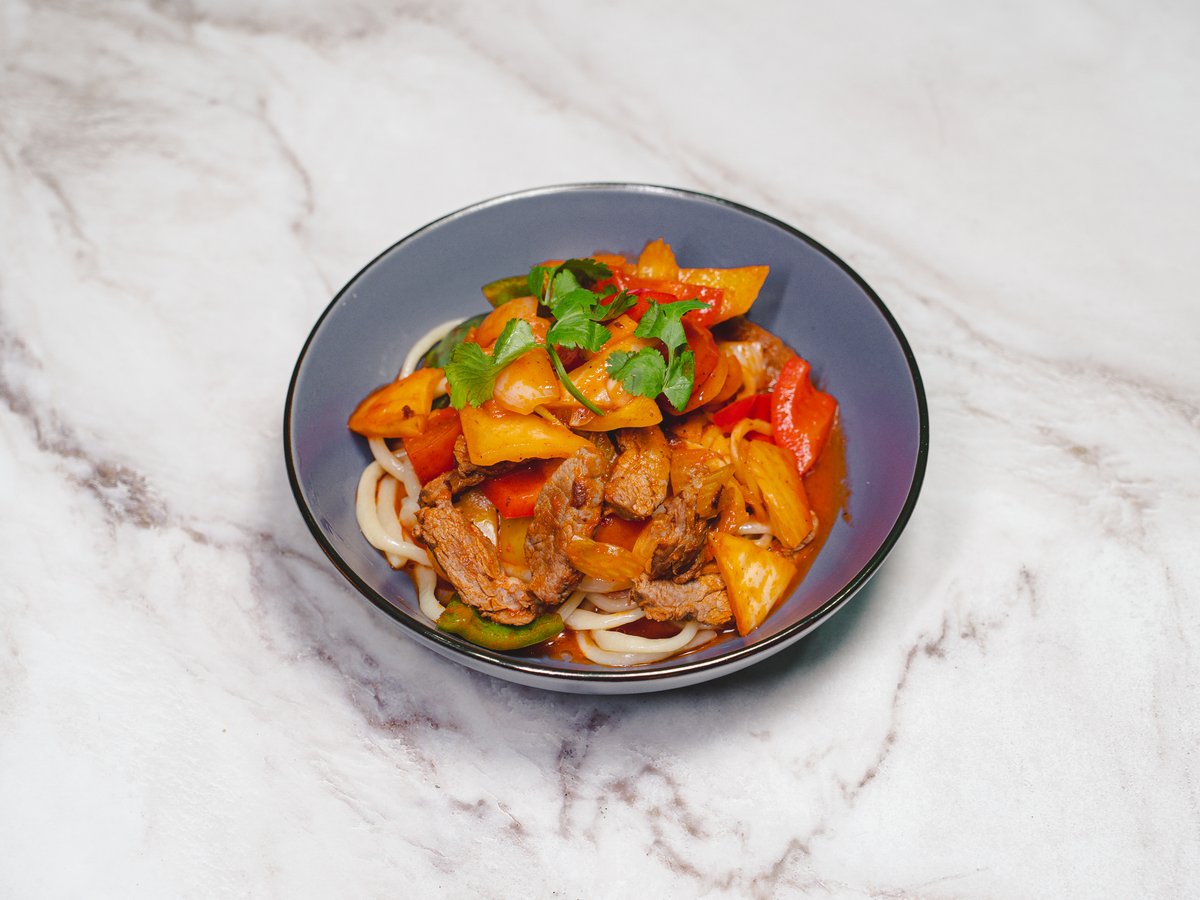 Говядина, лапша, шампиньоны, яйцо, терияки и соевый соус