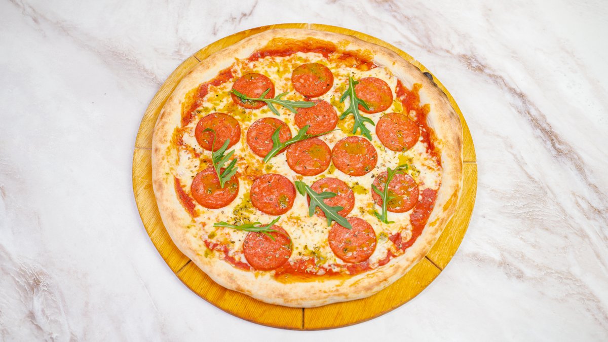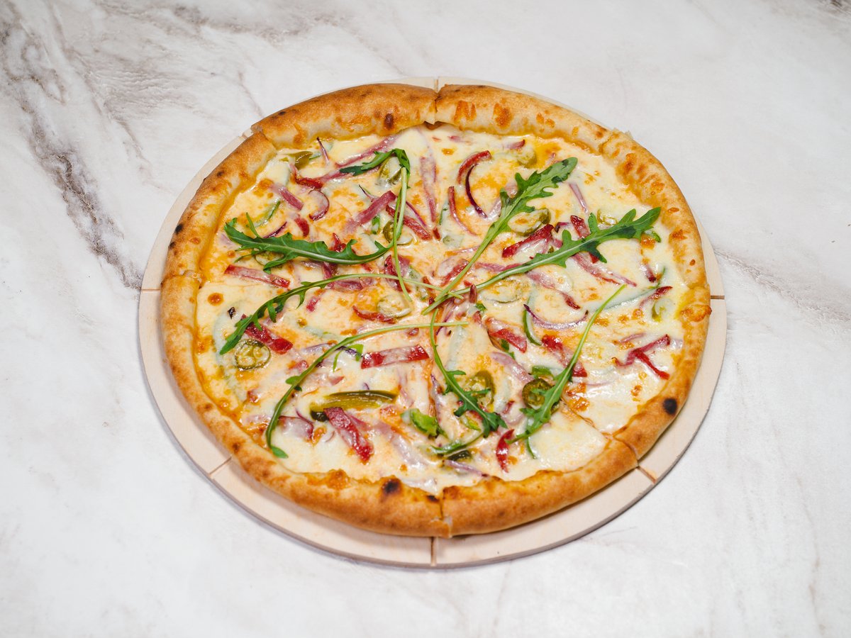 Тесто, сыр,соус томатный,копченая курица,копченая говядина,колбаски,фарш говяжий