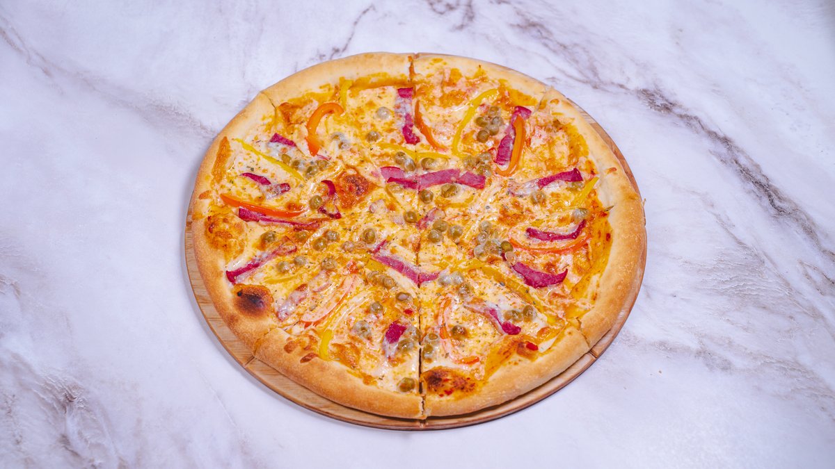тесто, сыр, соус томатный, копченая говядина, перец болгарский, горошек