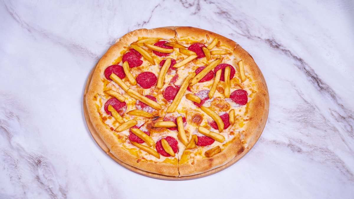 тесто, сыр, соус томатный, колбаски,фри
