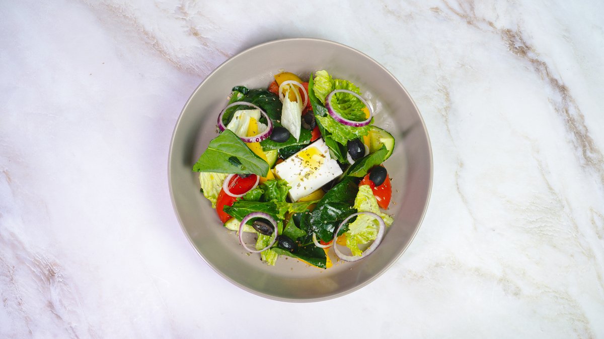 микс из свежих овощей, маслины, сыр Фета, соус
