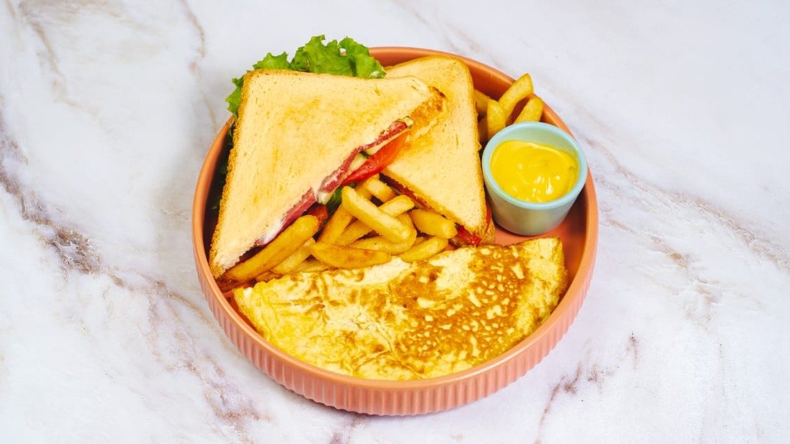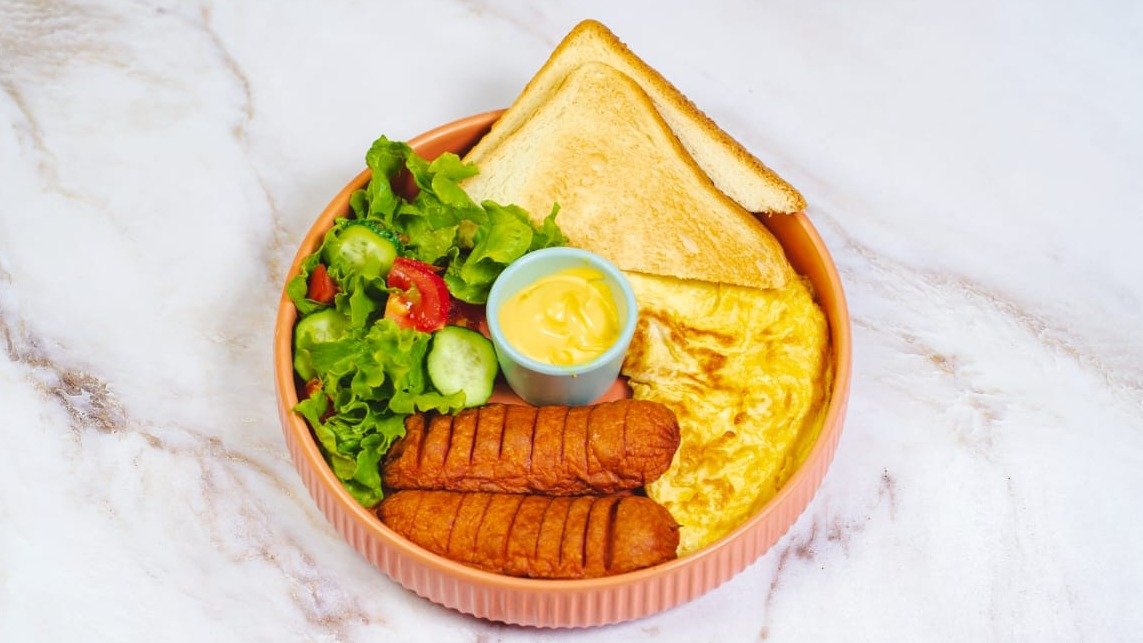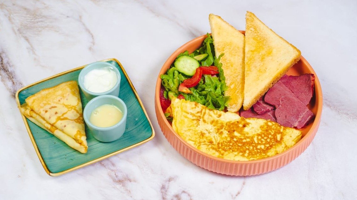 омлет, колбаски говядина, тосты. мик салата