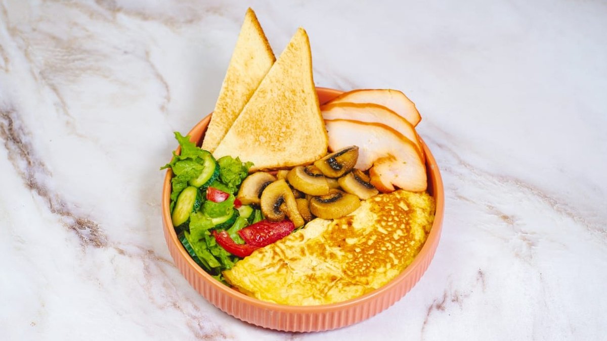 омлет , микс зелени, курица, шампиньоны
