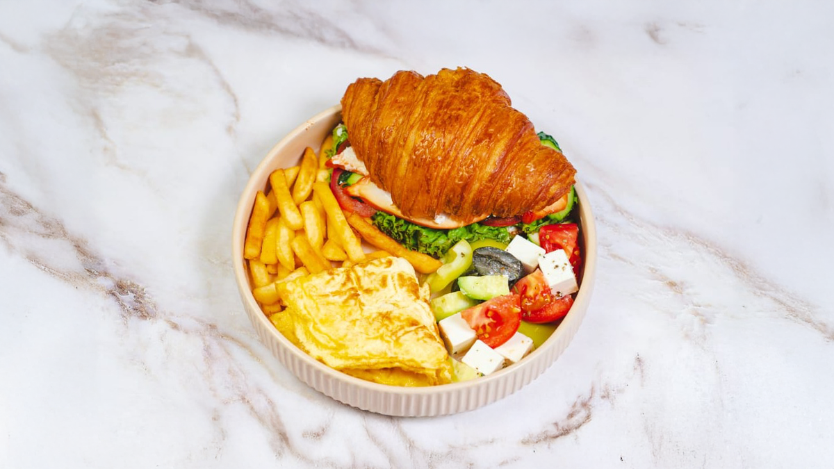 скрембл круассан с куриным филе и сыром, овощной салат, картофельные дольки