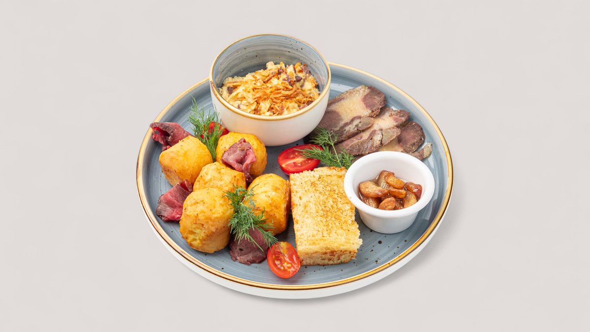Нежный скрембл с копчёной кониной, томлёные картофельные биточки, вяленая конина, хрустящий луковый тост, томаты черри и микрозелень. Подаётся с томлёным чесноком и луком фри.