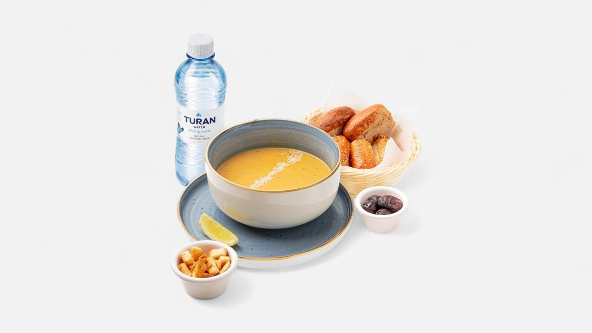 Суп "Чечевичный крем-суп" мини, салат "Греко" мини, паста "Альфредо" мини, вода, финики