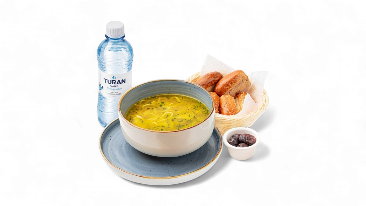 Суп "Домашний куриный", креп с курицей и грибами, вода, финики