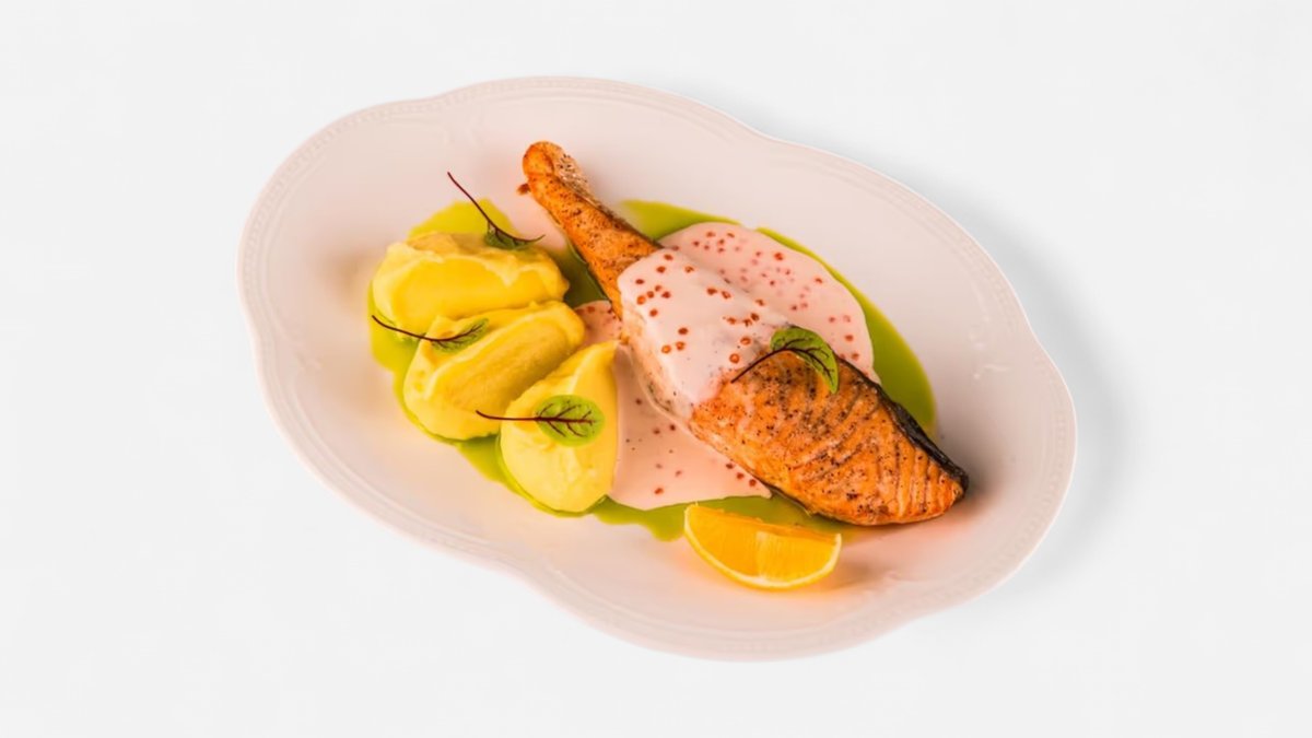 Salmon Steak in a Creamy Caviar Sauce with Mashed Potatoes