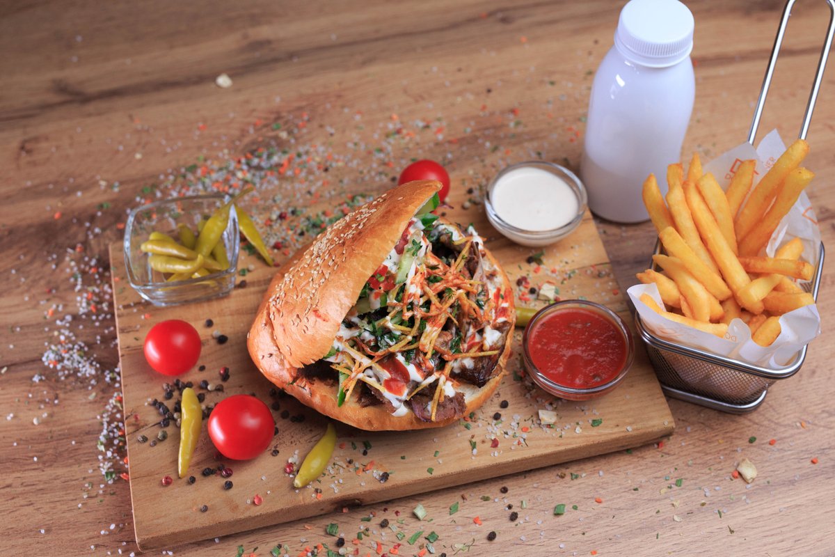 лепешка ,красный/белый соус,пом.огур.свеж.,мясо говяжье,куриное филе, картофель пай,лук красный,зелень