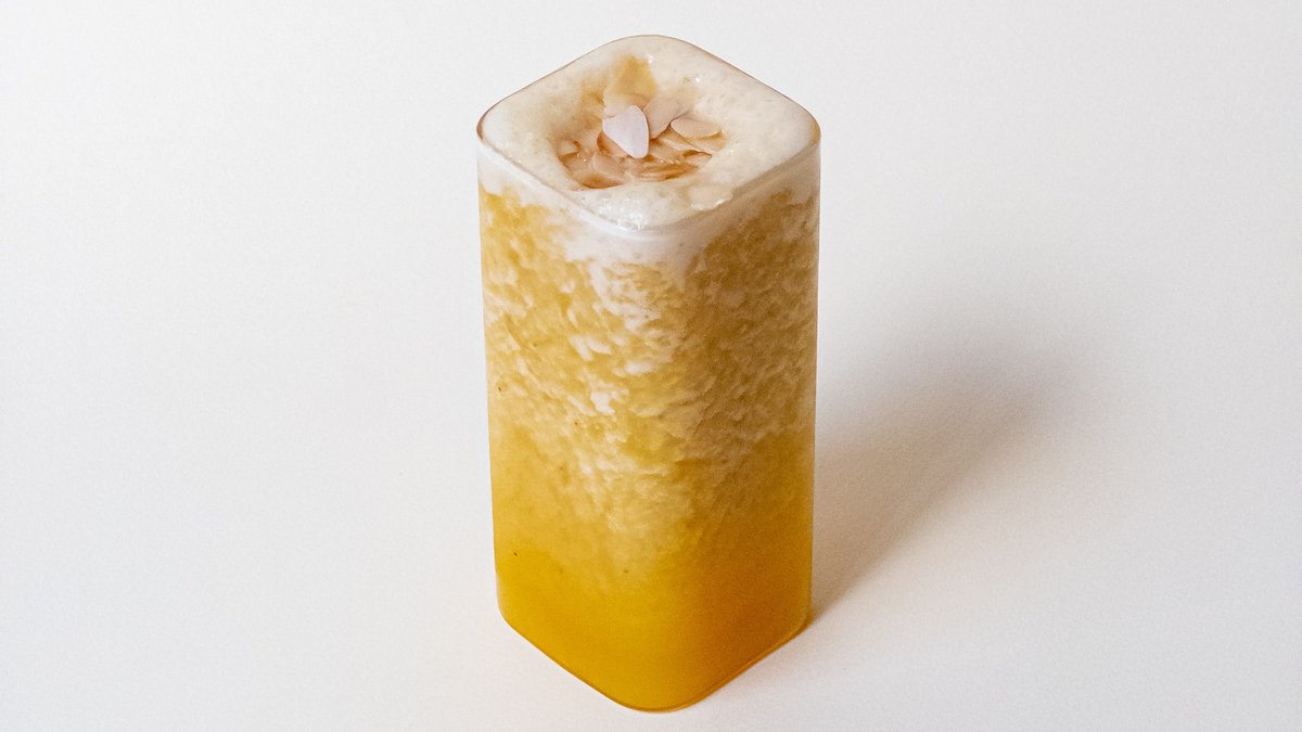 Айсти на основе жасминового чая со вкусом персика и розы, с добавлением кокосовых долек.