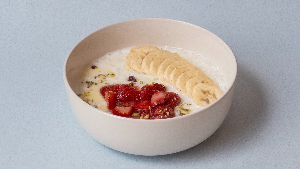 Рисовая каша, банан, клубничный фламбэ, фисташки