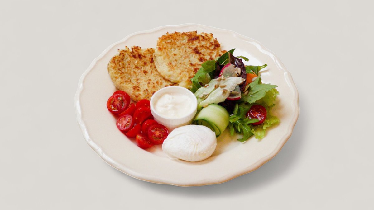 Драники, микс салата, пашот, черри, сметана