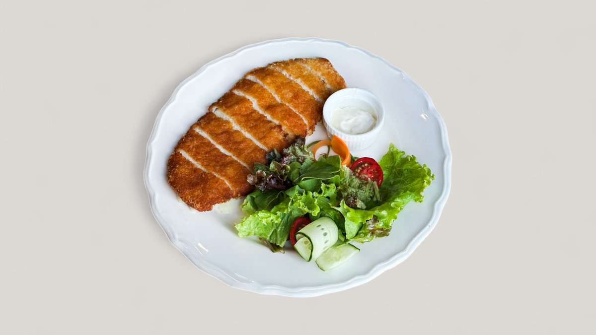 Куриный шницель, картофельное пюре, микс салата, чесночный соус