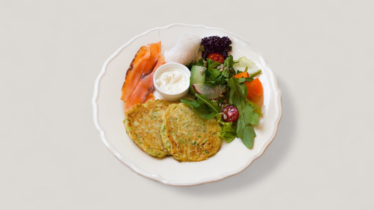 Драники, микс салата, пашот, лосось, сметана