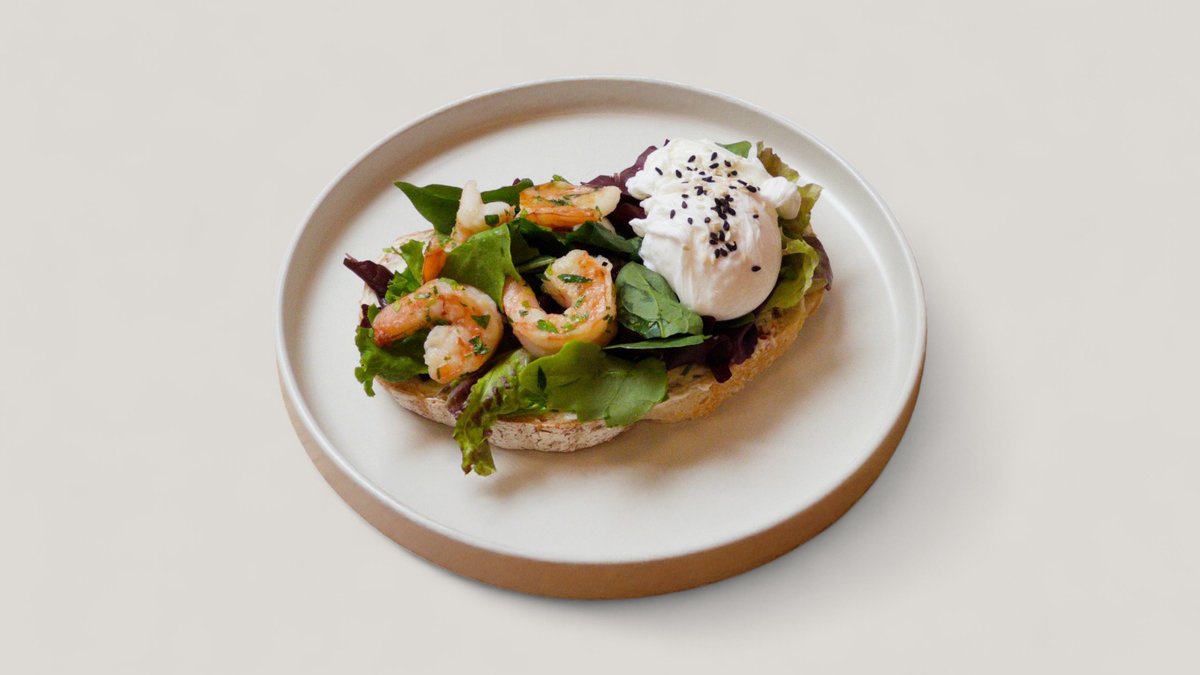 Брускетта с креветкой и яйцом пашот