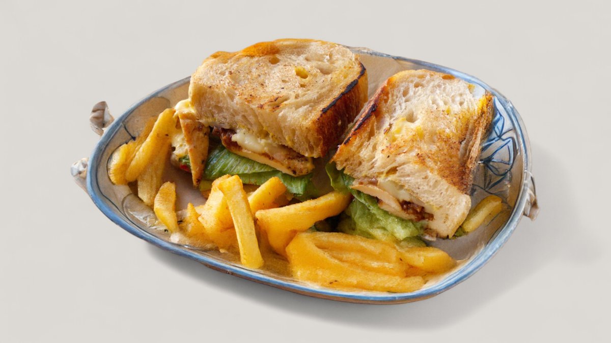 Тартин, куриное филе, помидор, айсберг, моцарелла. Подается с фри