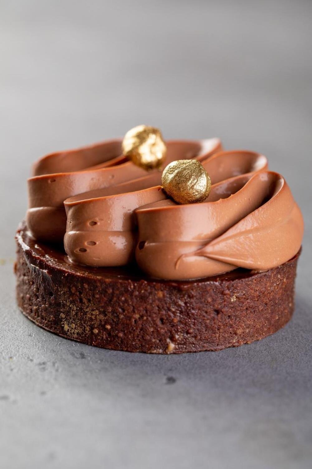 Шоколадное сабле, шоколадный бисквит, фундучно-миндальное пралине, шоколадный ганаш, украшенное взбитым ганашем на темном шоколаде и фундуком