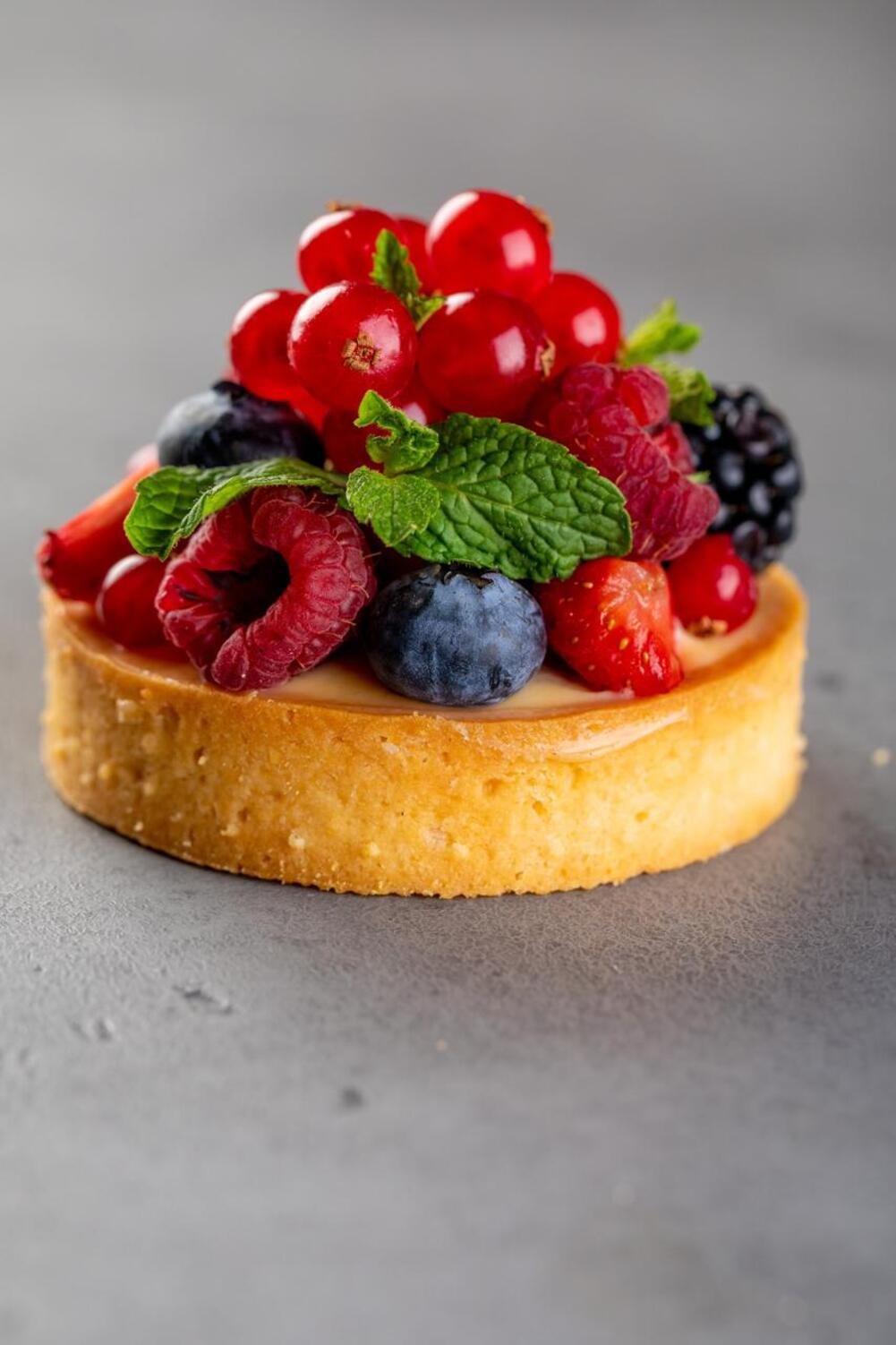 Классическое сабле, миндальный франжипан, смородиновое конфи, ванильный ганаш, микс свежих ягод и лепестки мяты