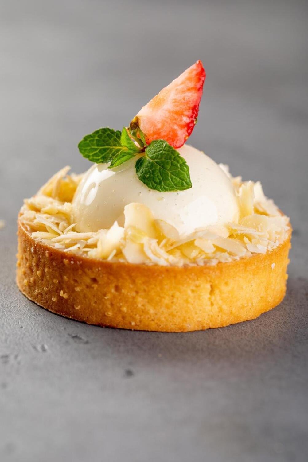 Классическое ванильное сабле с франжипаном, клубничным конфи, ванильным ганашем, украшенное полусферой из лаймового мусса, миндальными слайсами и свежей клубникой