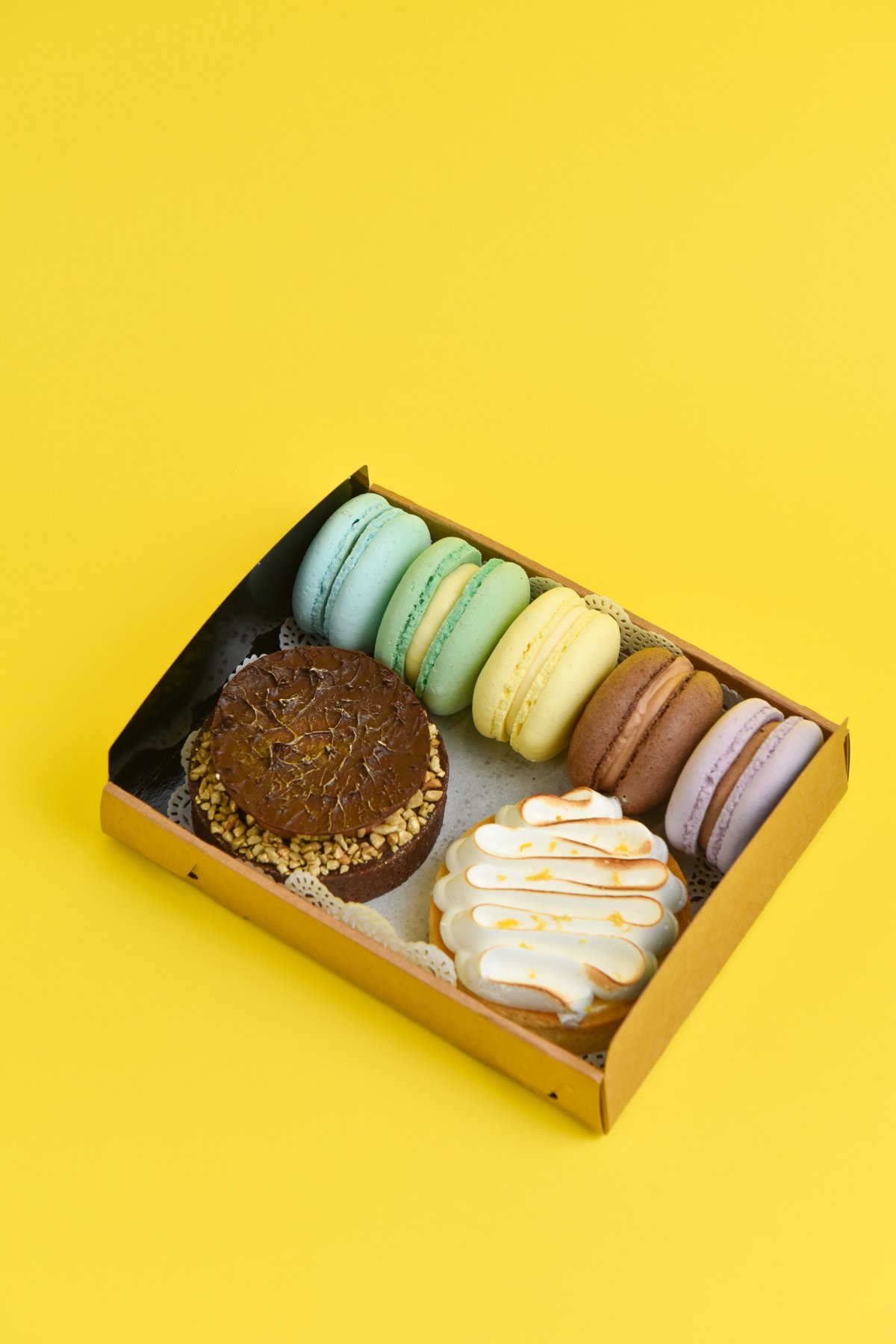 Набор из 2 тарталеток (цитрон и сникерс) и макарон ассорти 5 шт. (макарон могут отличаться по цвету) Размер коробочки 16*14*6