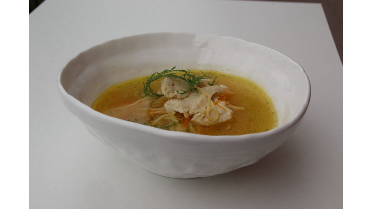 Куриный бульон, мясо цыплёнка, лапша, морковь, зелень.