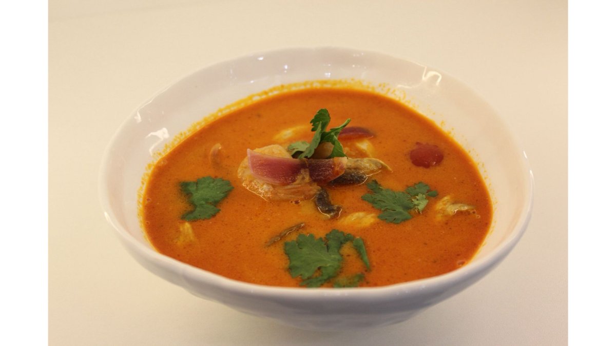 Бульон том ям, креветки, кальмары, грибы, кокосовое молоко, лайм, кинза подается с рисом.