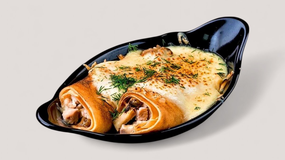 Тонкие блинчики с нежной курицей и ароматными грибами в сливочном соусе
