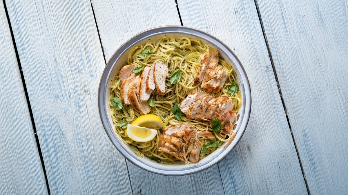 Ароматная паста с соусом из свежего базилика, пармезана и нежного куриного филе