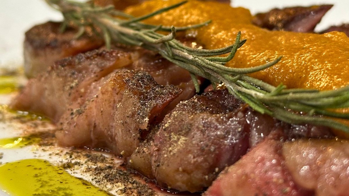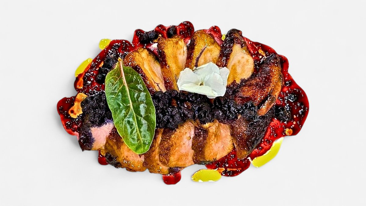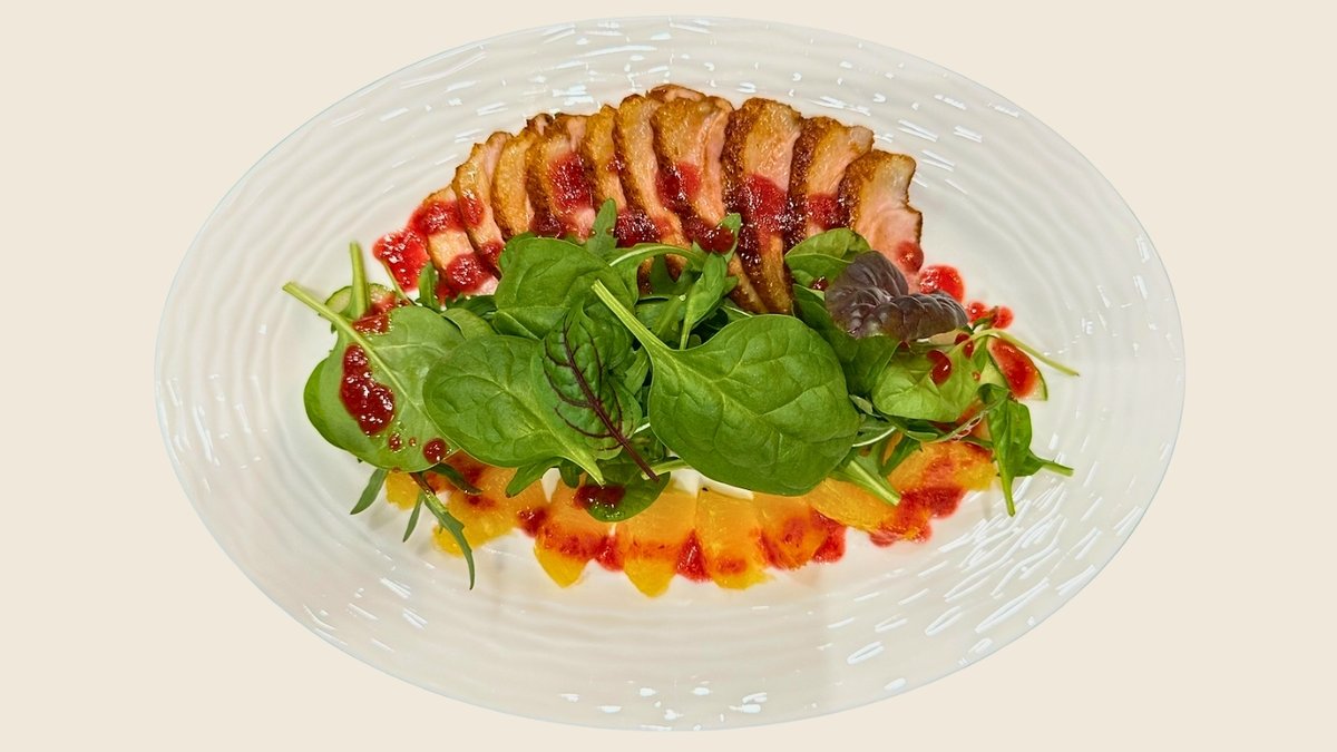 Duck fillet, orange, raspberry sauce. A contrast of sweet and sour delight.