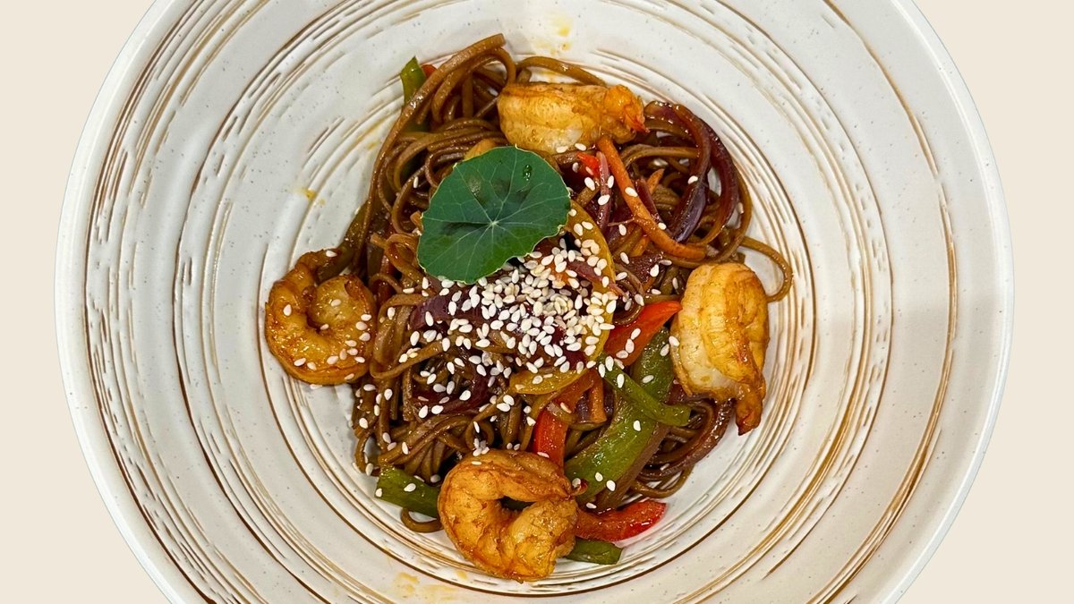 With duck/shrimp, vegetables, and teriyaki sauce. A taste of Asia with a steppe twist