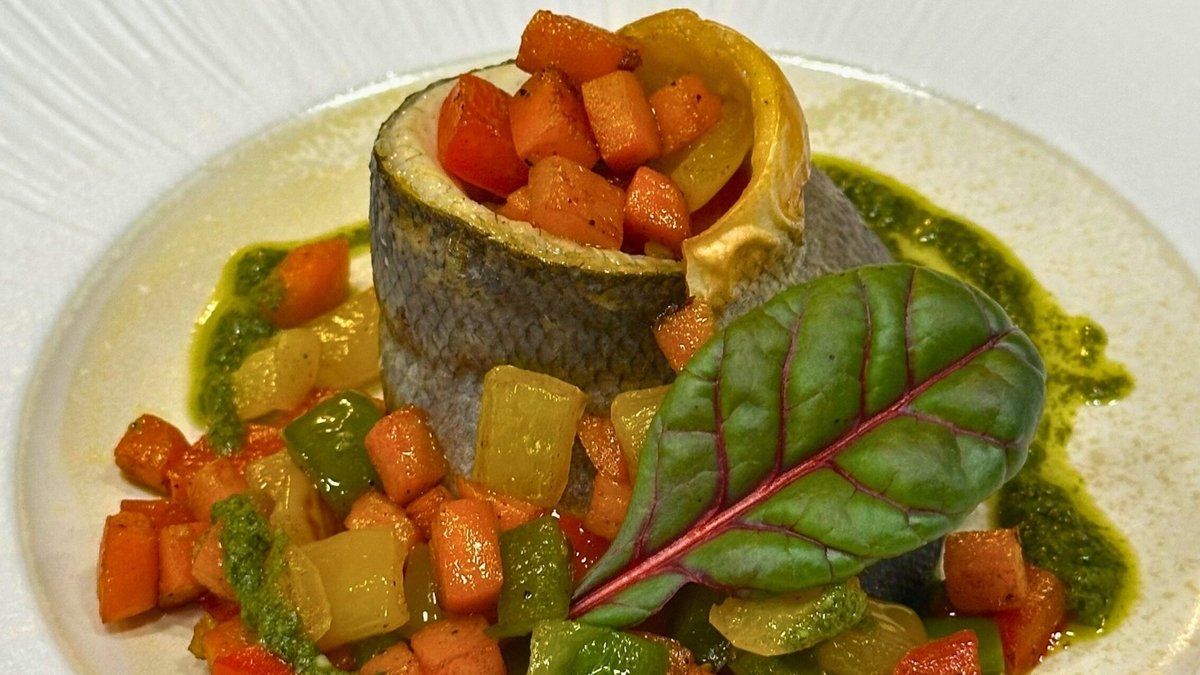 Grilled fillet with green butter and vegetables. The freshness of the sea on a plate
