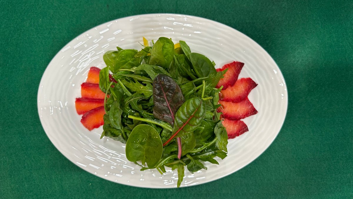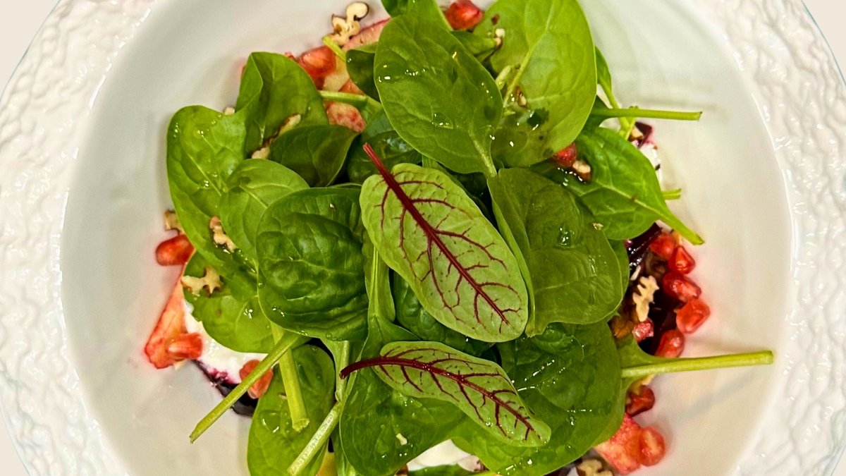 Kospa, figs, pumpkin, lettuce, spinach, pistachios. Delicate greens with raspberry sweetness.
