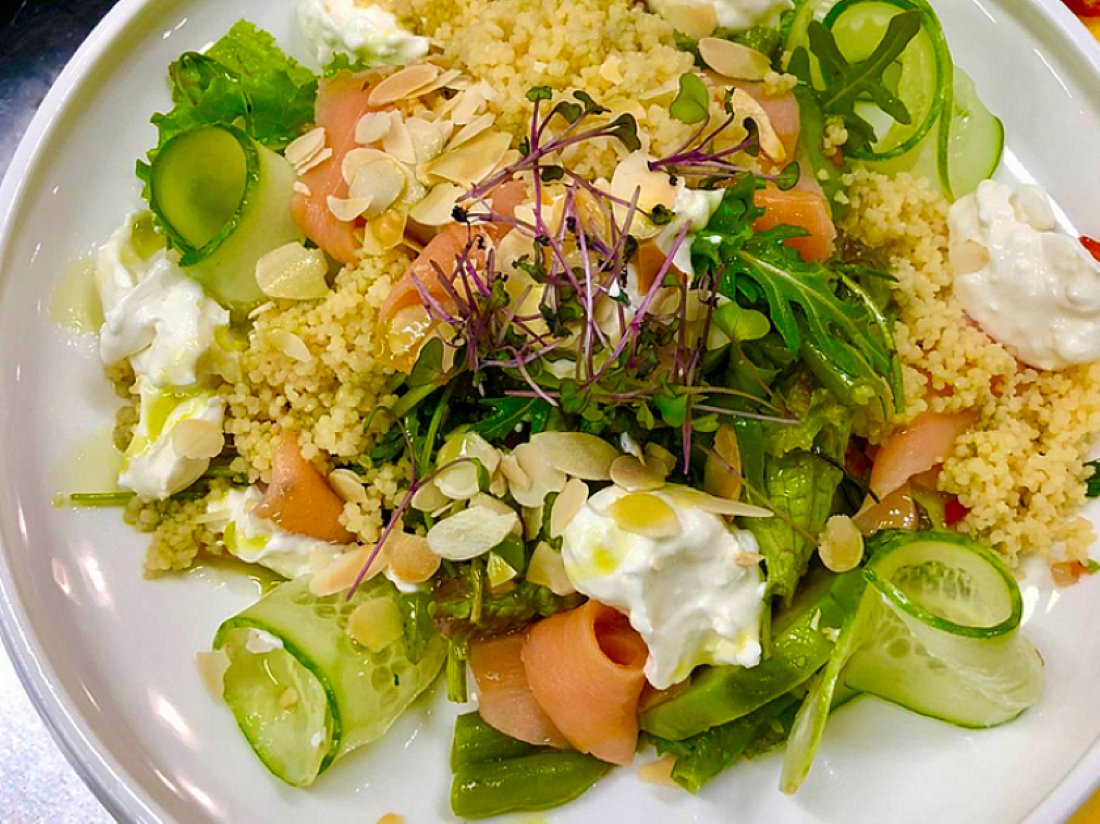 Яичная глазунья со свежим салатом из зелени говяжьими колбасками и шампиньонами, тост под соусом креметто с авокадо, свежие овощи с сыром фета, консервированная кукуруза, мёд. Свежесваренный чай/кофе на ваш выбор.