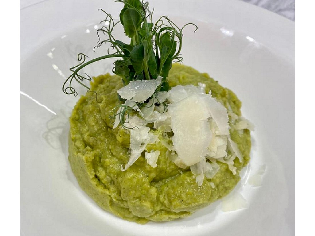 Запеченная свекла маринованная в бальзамическом уксусе, подается с миксом салата, дольками апельсинов, сыром дорблю и сливочно-ягодным кремом.