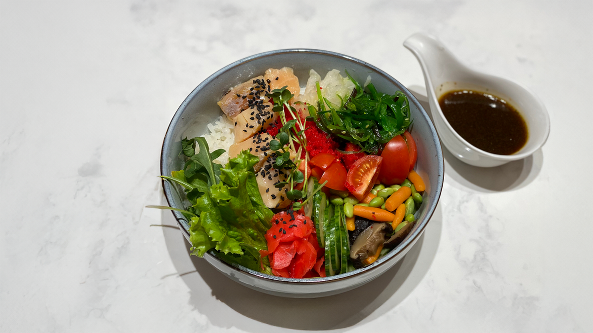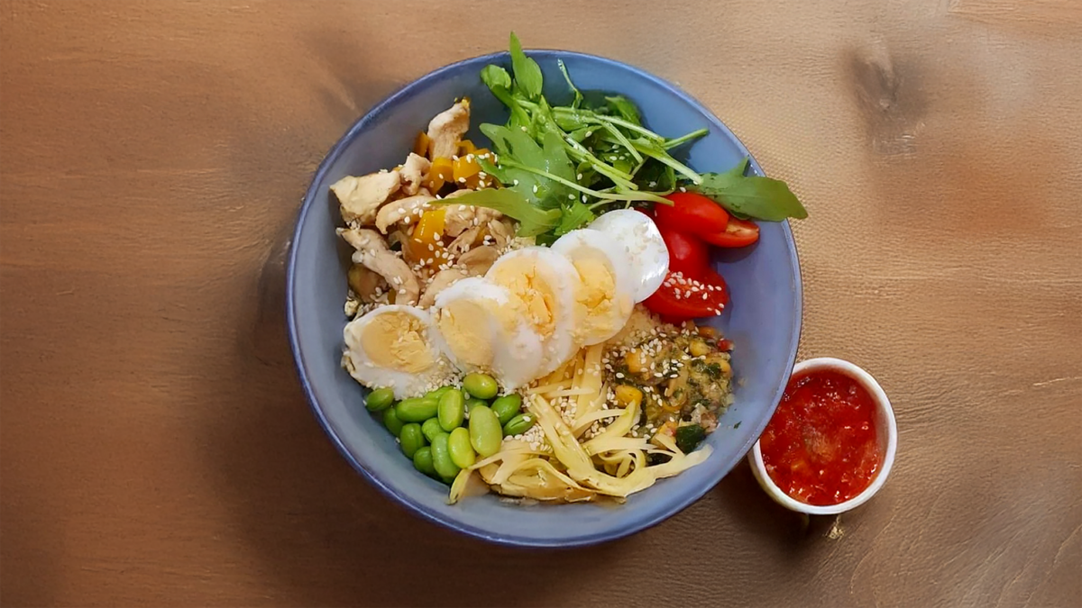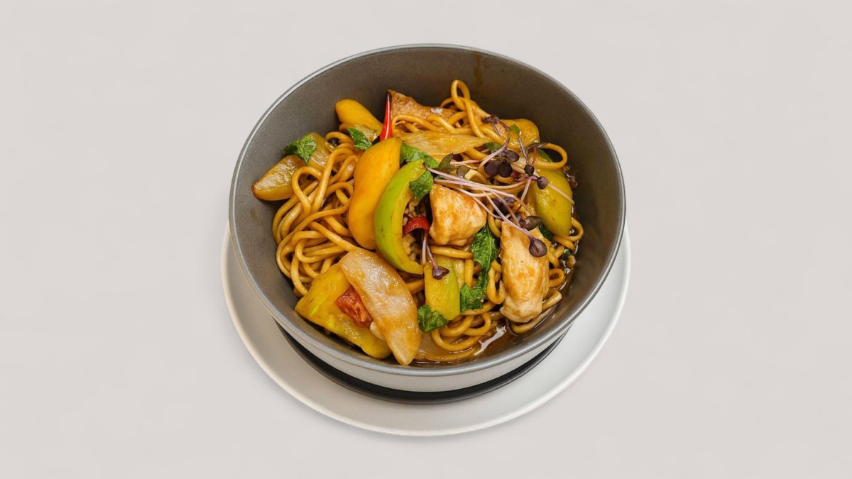 Состав : Курица филе , соус соевый ,соус Ширачи , соус фирменный , лук красный , перец светофор лапша рисовая кунжут белый черри