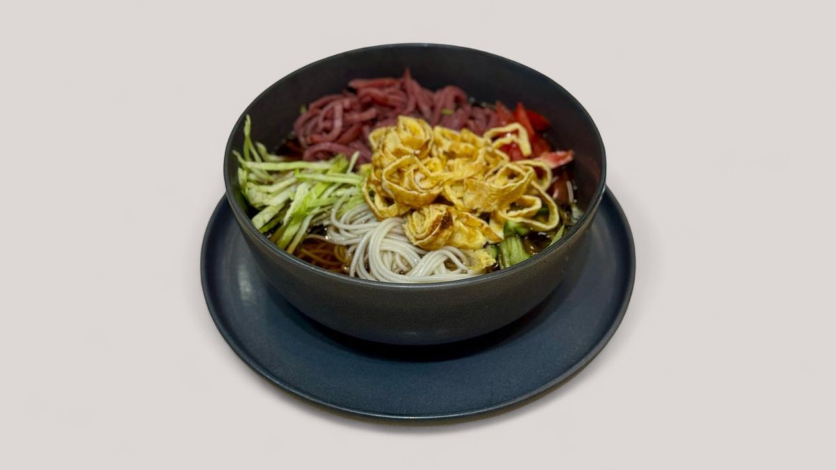 Состав : Говядина мясо обжаренное, огурцы свежие, капуста по корейский, соломка из омлета ,бульон для Кукси