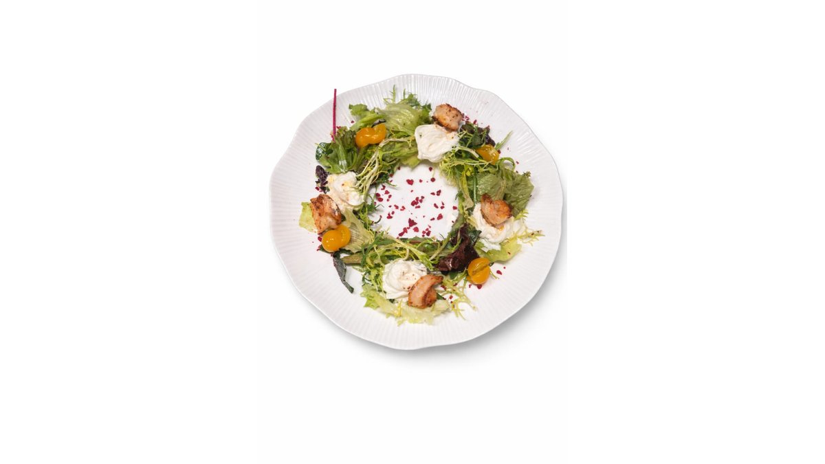 Delicate stracciatella, ripe cherry tomatoes, fresh greens, and aromatic cold-pressed olive oil. Light and sophisticated.
