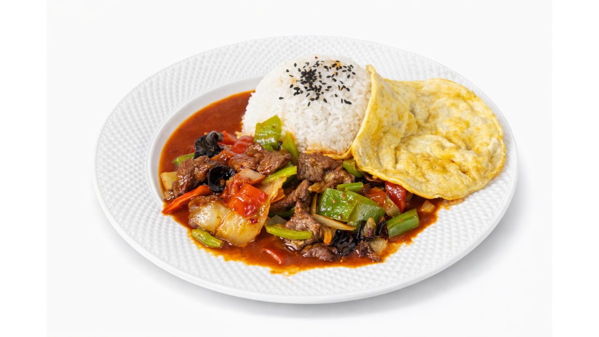 Aromatic meat with vegetables and wood ear mushrooms in a signature sauce, served with rice.