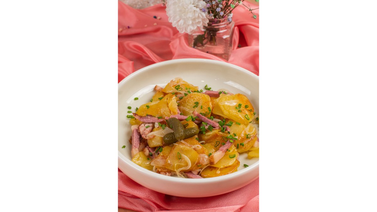 Телятина, говяжья печень, обжаренный картофель с луком