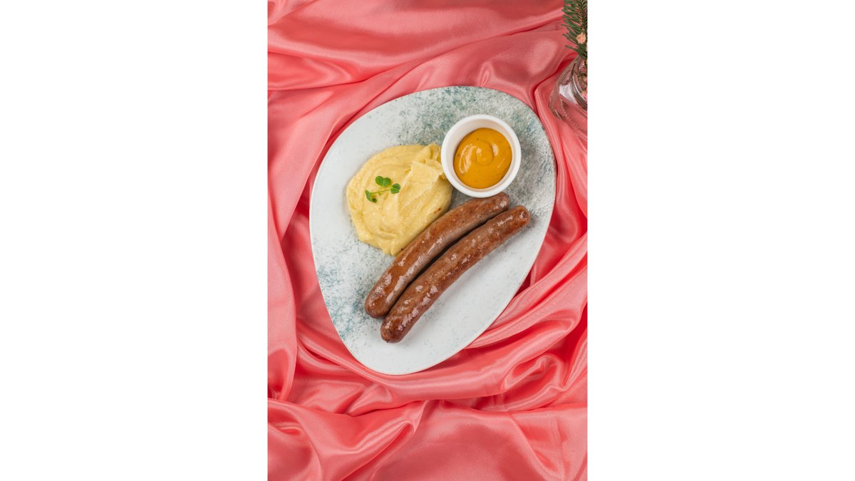 Куриные колбаски 2 шт, пюре и горчичный соус