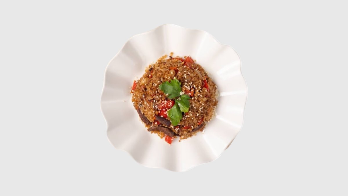 Рис, говядина, морковь, лук, болгарский перец, cоевый соус, яйцо, кунжут