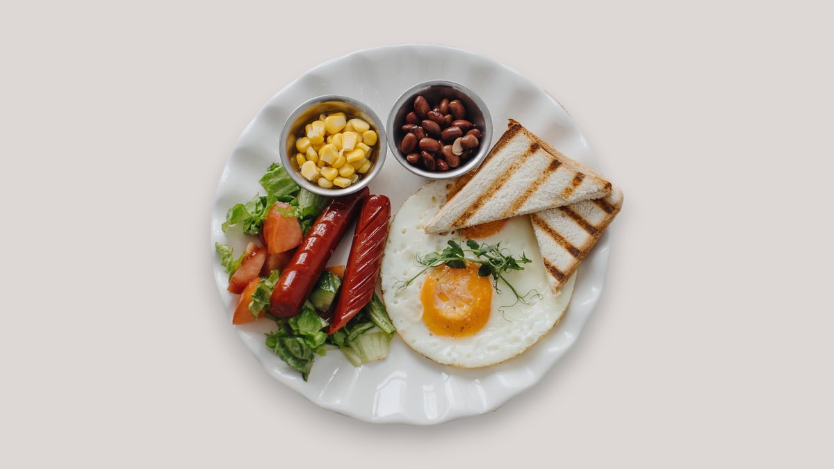 Листья салата, помидоры, огурцы, яичница, говяжьи колбаски, кукуруза, фасоль, бальзамический соус, тостер хлеб