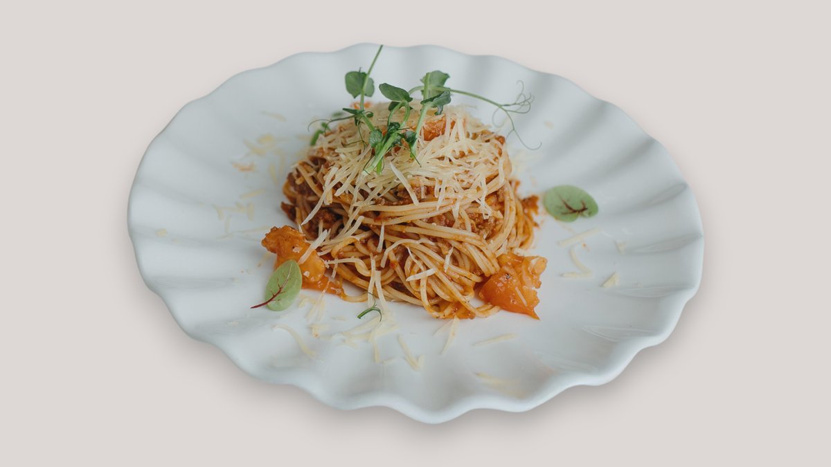 Говяжий фарш, лук, морковь, томат, спагетти