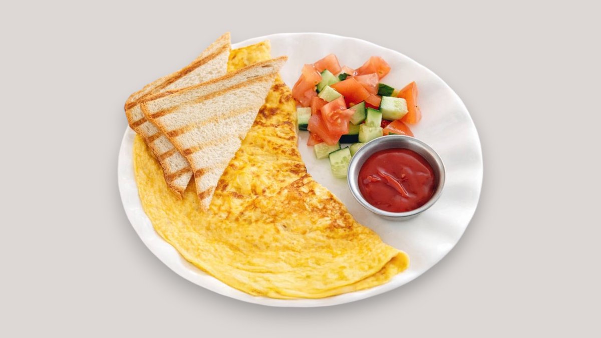 Омлет, помидоры, огурцы, кетчуп соус, тостер хлеб