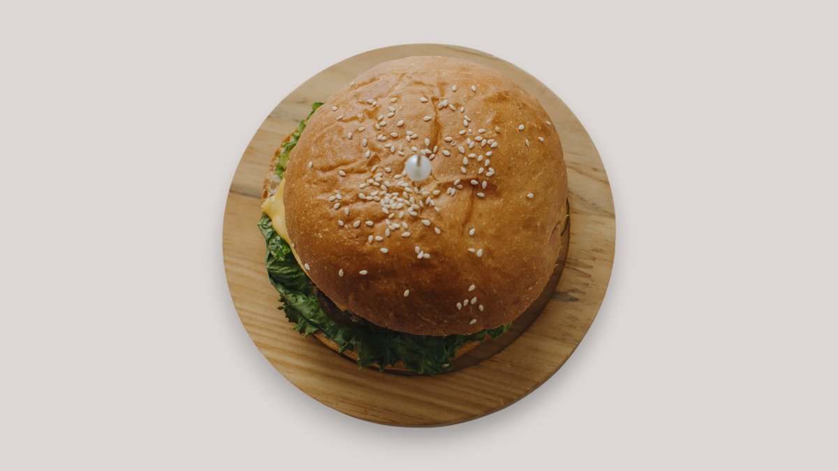 Булочка, говяжья котлета, соус цезарь, соус кетчуп, огурцы маринованные, помидоры, листья салата, сыр чеддер