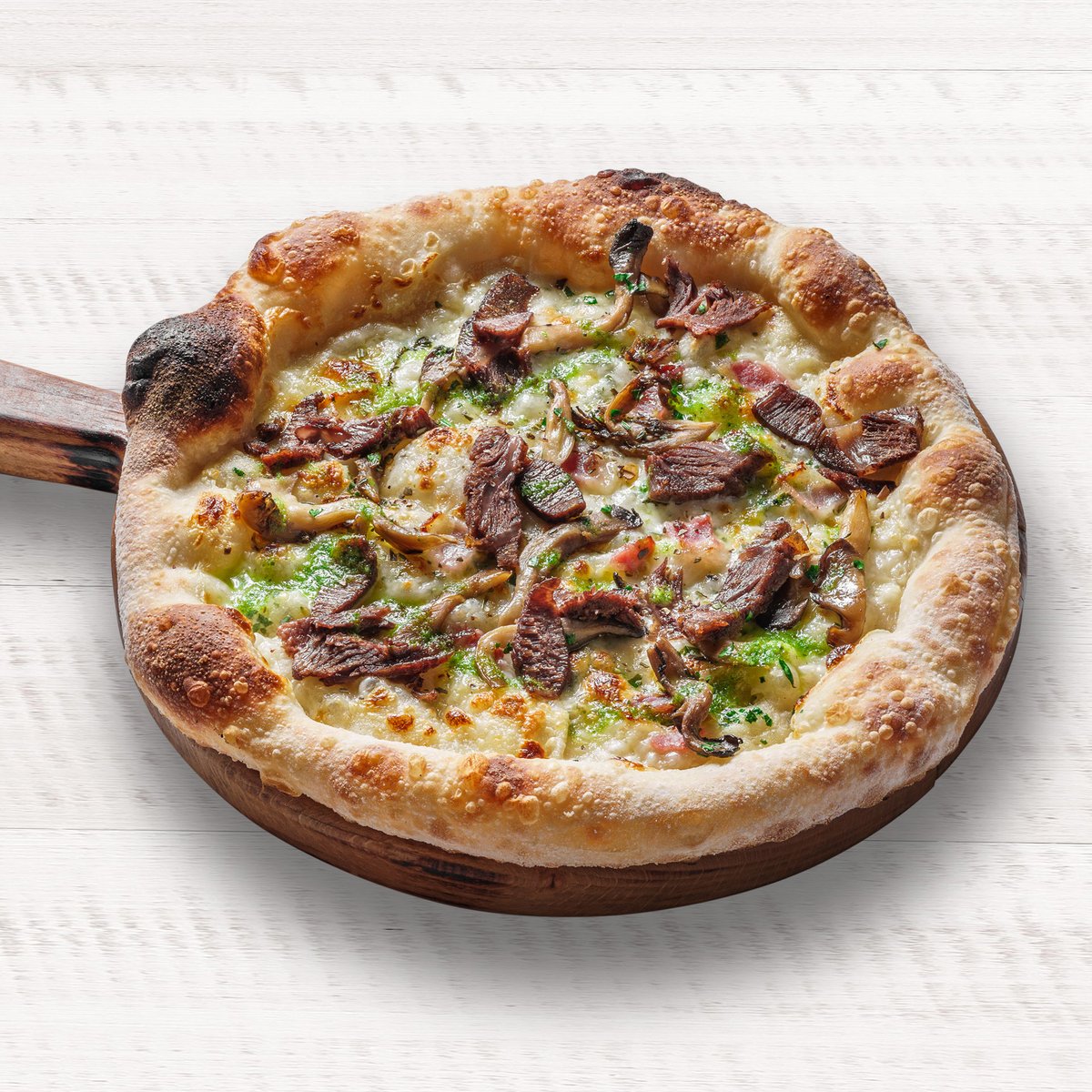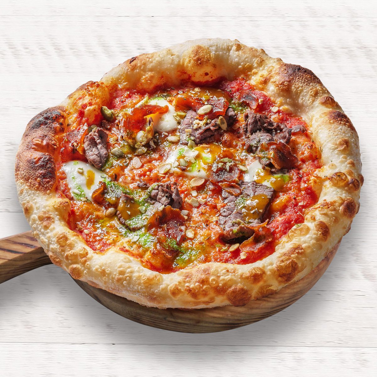 Фирменная пицца с рубленным мясом, копченой говядиной, колбасками пепперони, ветчиной и грибами
