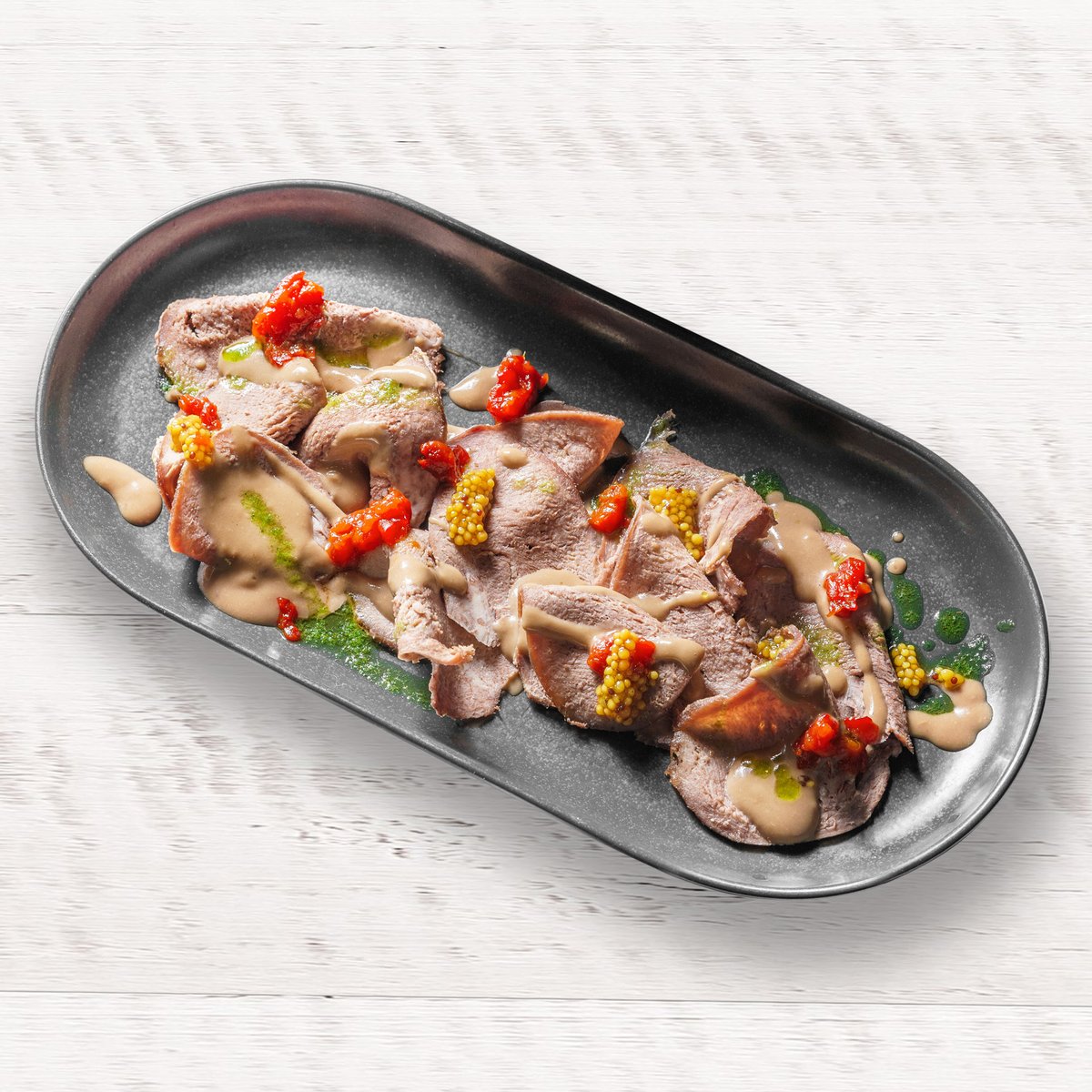 отварной язык, варенье из перца, сливочный соус Демиглаз с зерновой горчицей