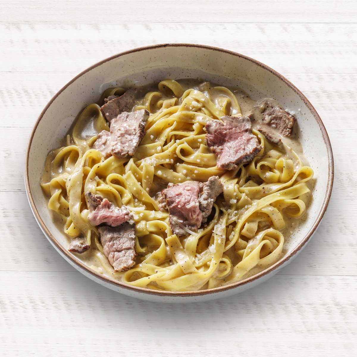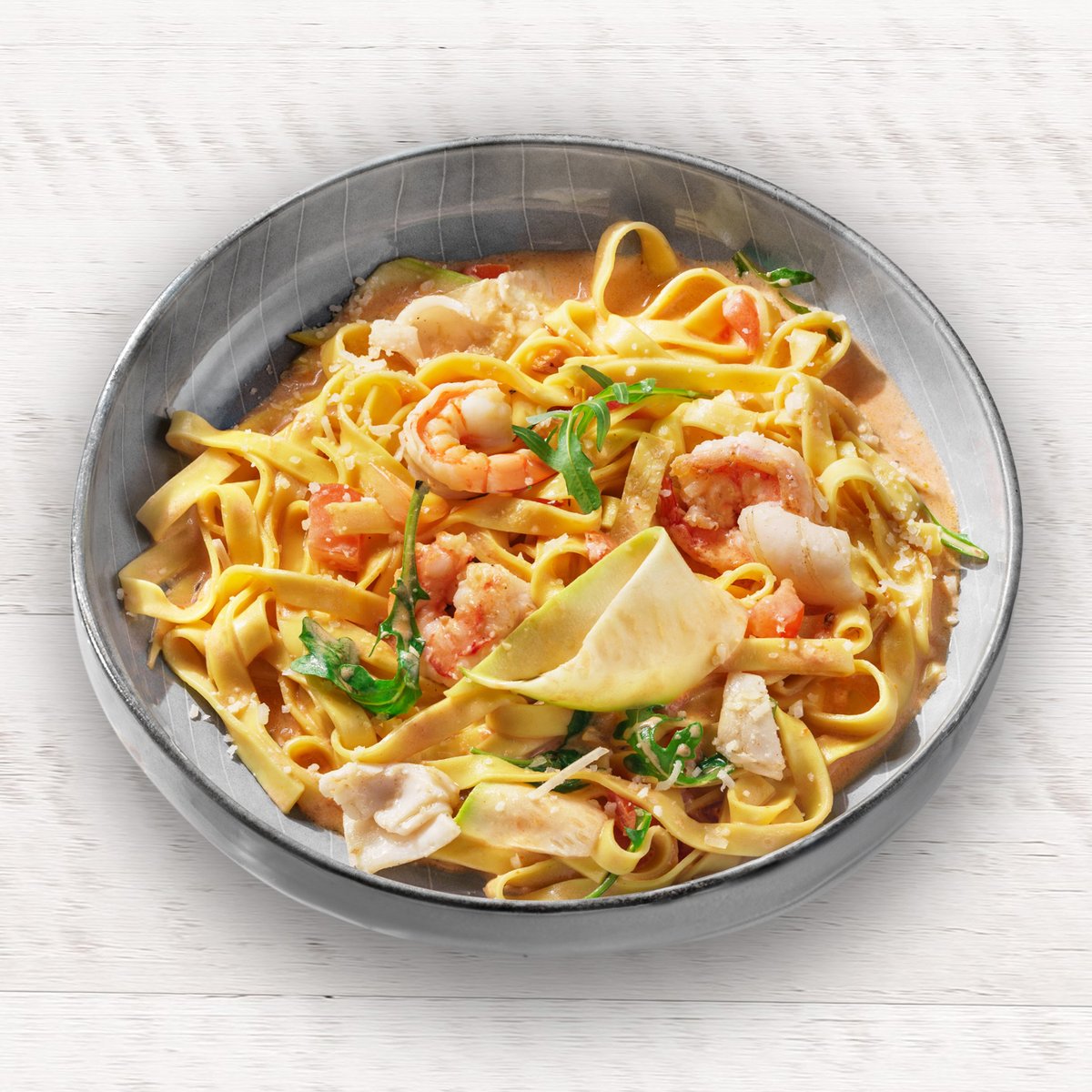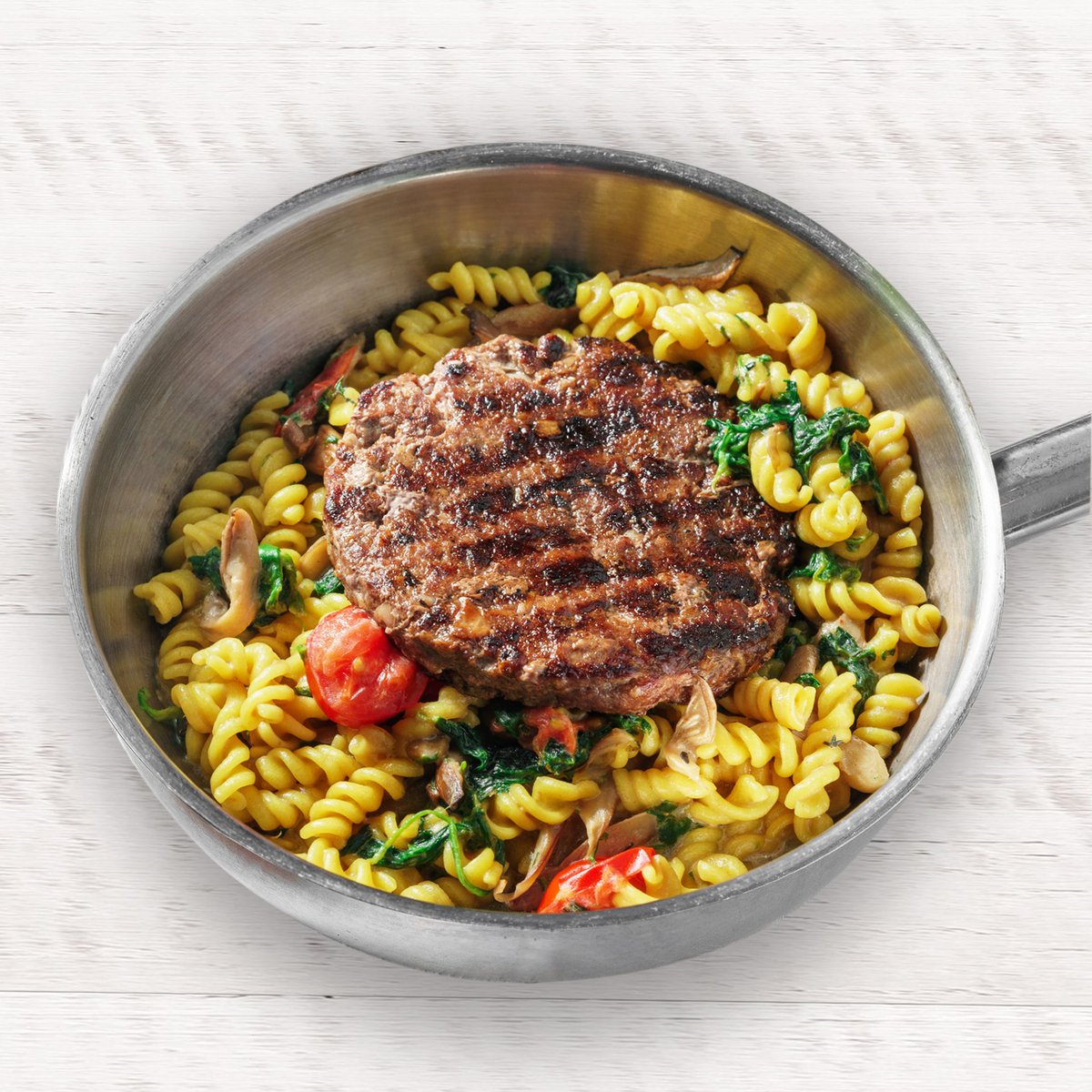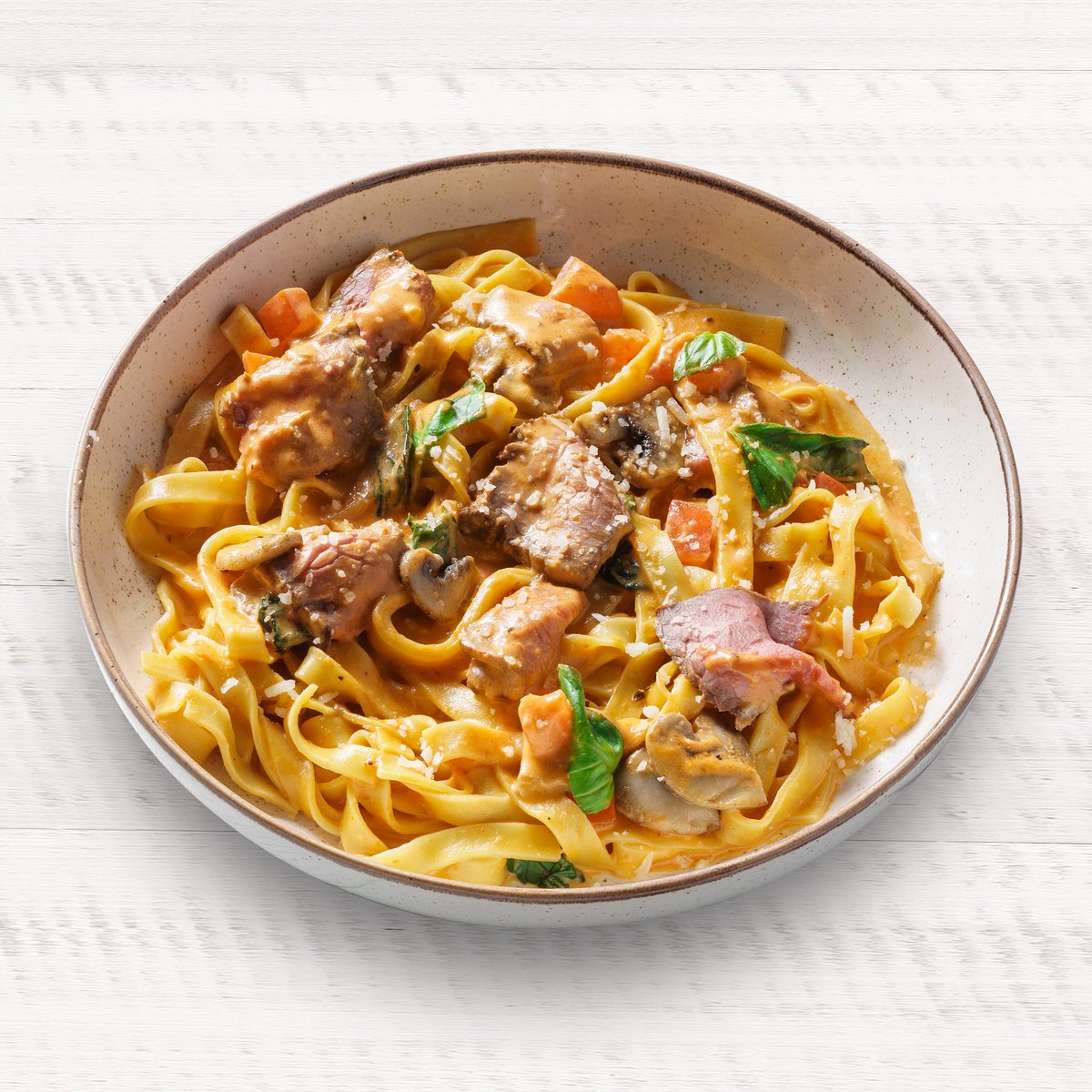 паста фузилли в сливочно-томатном соусе, с копченой говядиной и шаром из куриного фарша с сыром Моцарелла внутри